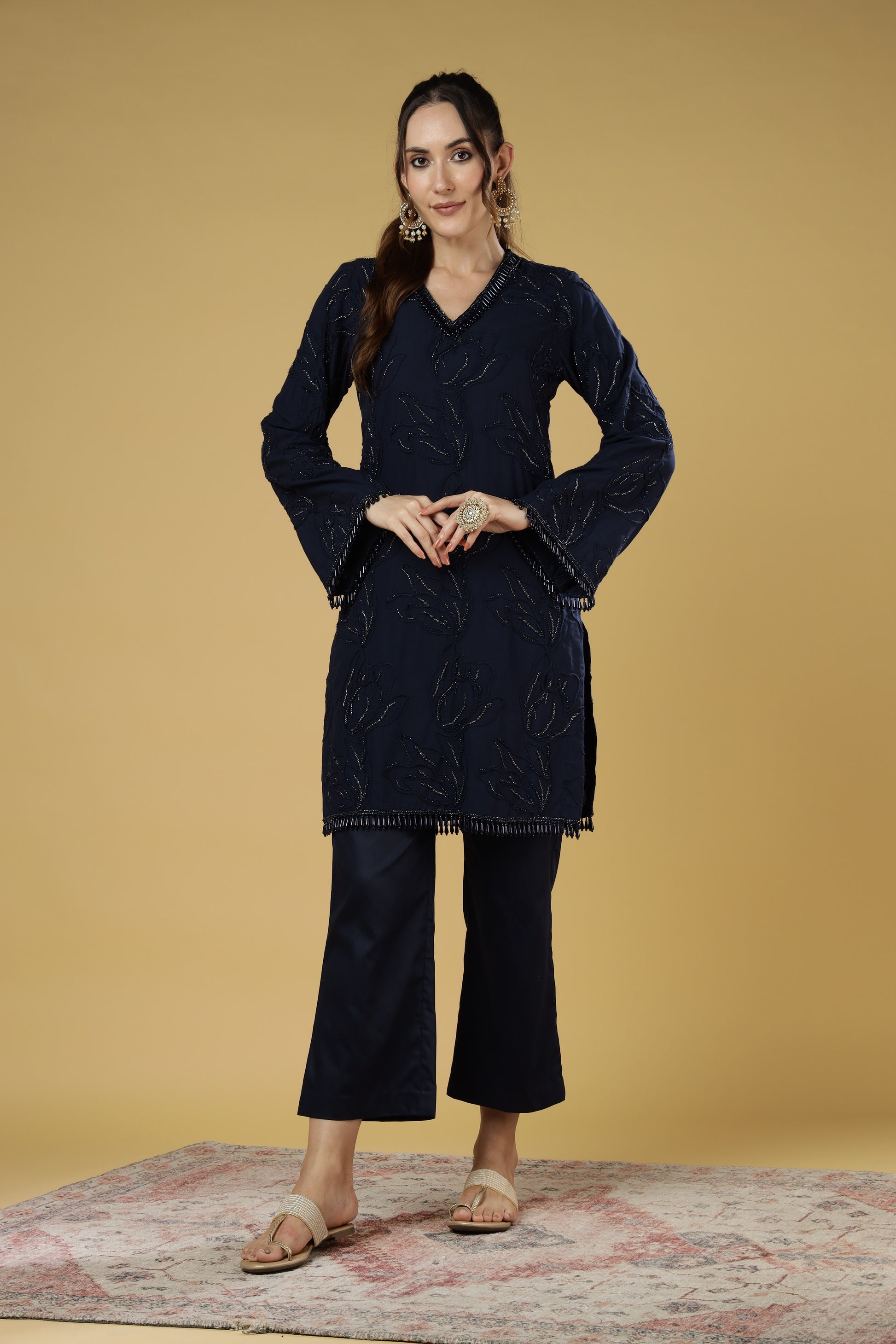 Elevate your everyday ethnic wardrobe with this chic navy blue kurta set. Crafted from a soft, premium fabric, this set features a straight-fit kurta adorned with intricate tonal hand-embroidery in elegant floral patterns. The kurta is designed with a V-neckline, flared bell sleeves with delicate fringe detailing and side slits for easy movement.