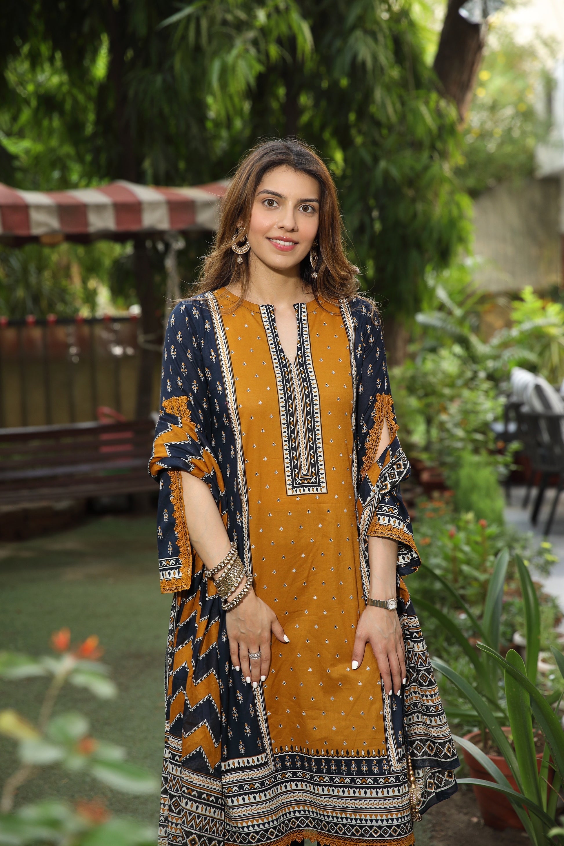 Step into elegance with this gorgeous navy blue kurta set. The contrast with the sleeve detailing and dupatta in soft hues is perfectly paired with a matching palazzo, while the dupatta adds an ethereal touch. It’s the definition of minimum effort, maximum impact, making it a versatile must-have in your wardrobe.