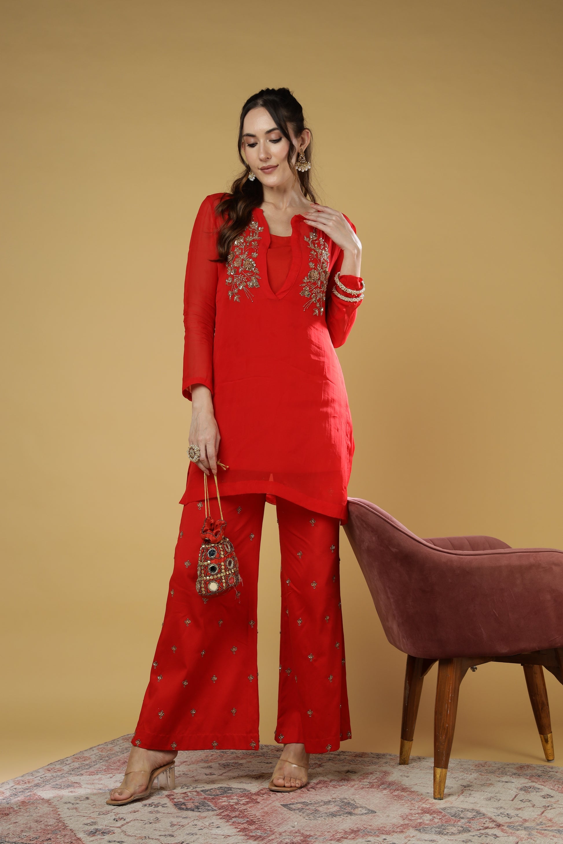 Make a bold and unforgettable statement with our exquisite red hand embroidered kurta and palazzo set. This striking ensemble features a beautifully tailored straight-cut red kurta adorned with delicate gold floral embroidery along the neckline and chest, adding a touch of regal elegance. The kurta’s stylish deep V-slit neck design and sheer full sleeves bring a modern, fashion-forward twist to a timeless classic.