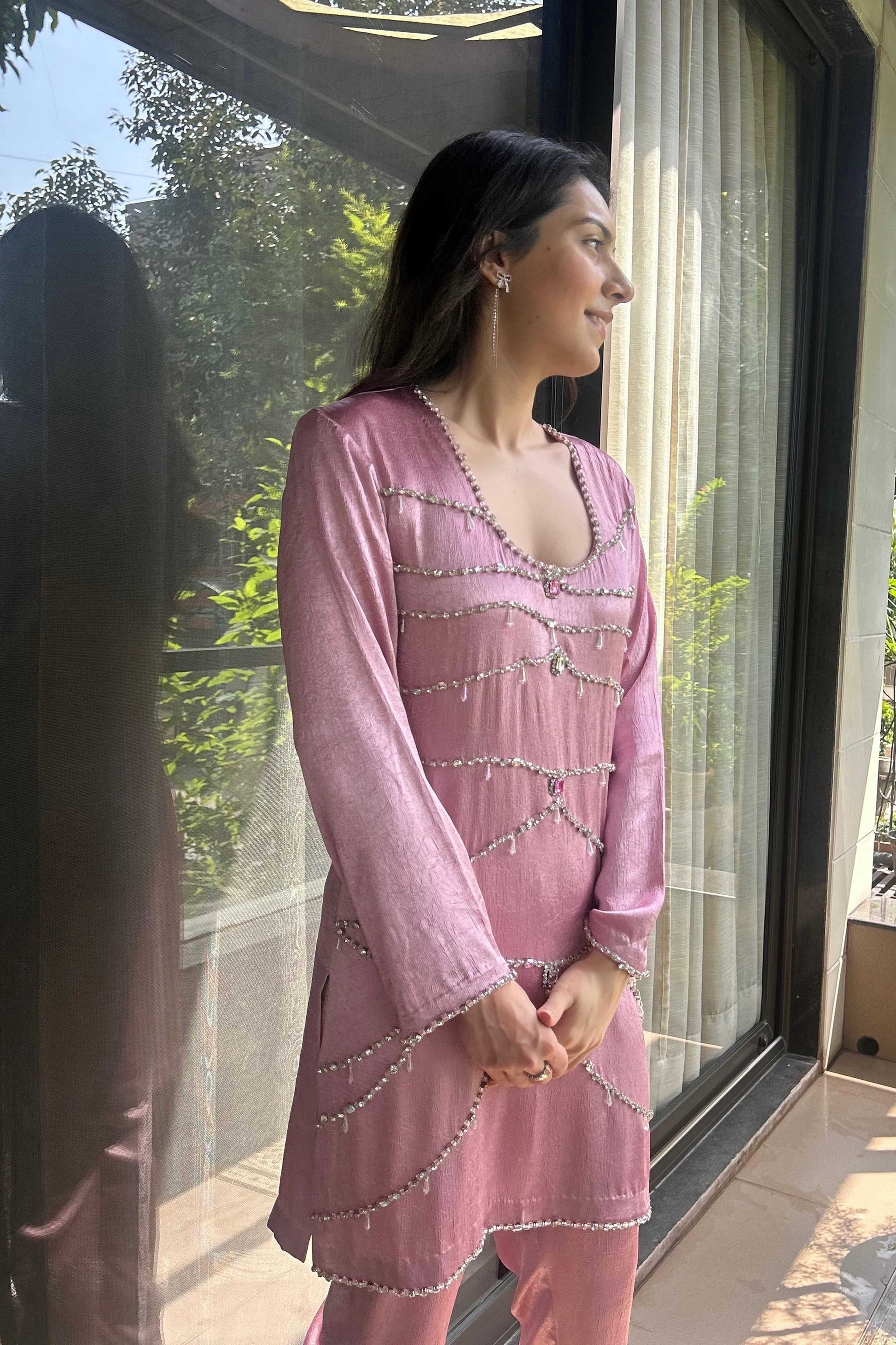 A pink hand work kurta set that balances ease with intricacy- embellished with delicate Swarovski, accented by subtle tones and paired with a pant to complete the look. It’s a great choice for celebrations that call for quiet beauty and timeless charm.
