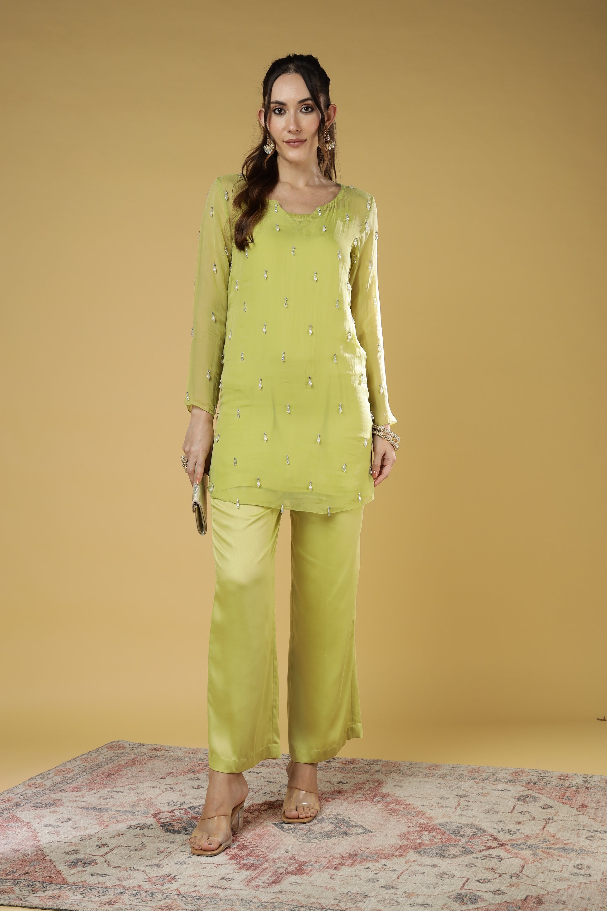 Elevate your festive wardrobe with this luxurious modal satin kurta set in a serene shade of green. Adorned with delicate embroidery and paired with tailored pants, it blends tradition with contemporary charm. Soft on the skin, rich in look — perfect for intimate celebrations or festive gatherings.