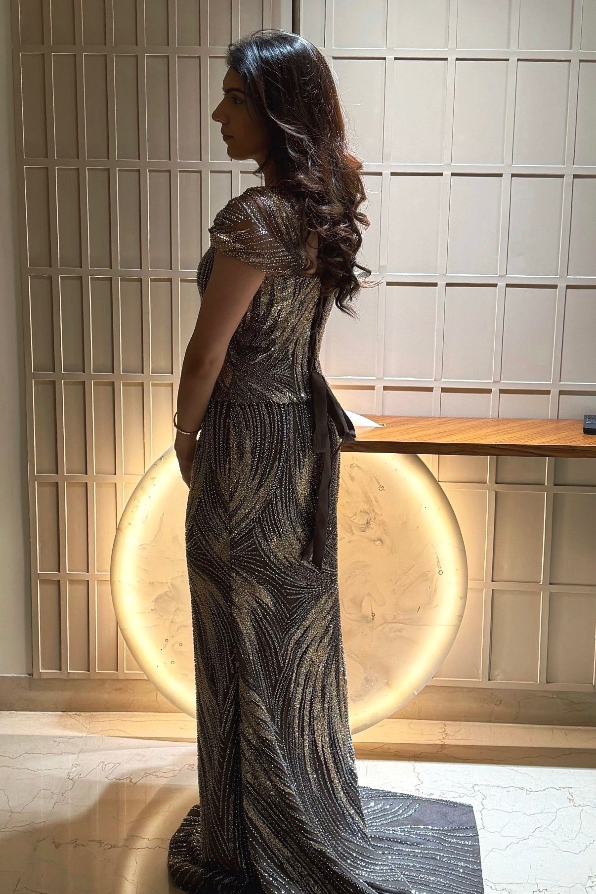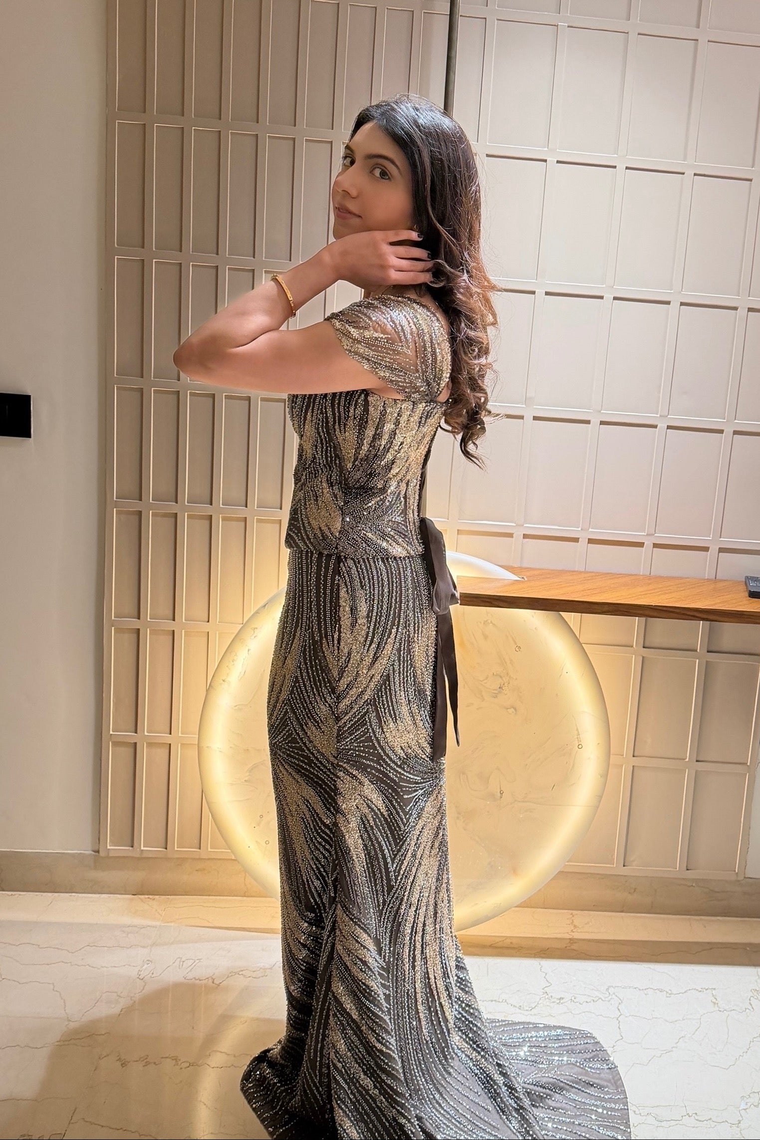 Sydney shines in pure net fabric. Embrace pure elegance in a show stopping gown designed to make you the center of attraction. Comes with a corset top and skirt. Whether you’re attending a cocktail party, or a glamorous evening soirée, this embellished masterpiece will ensure all eyes are on you.